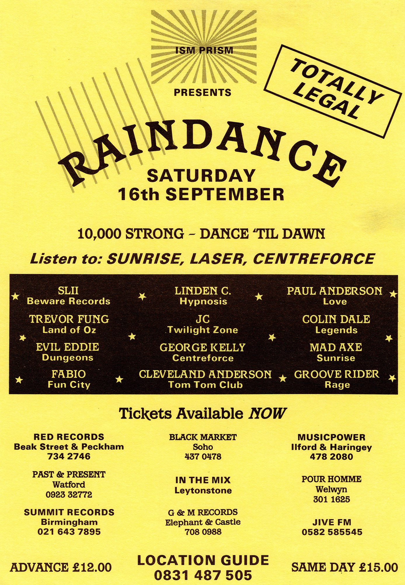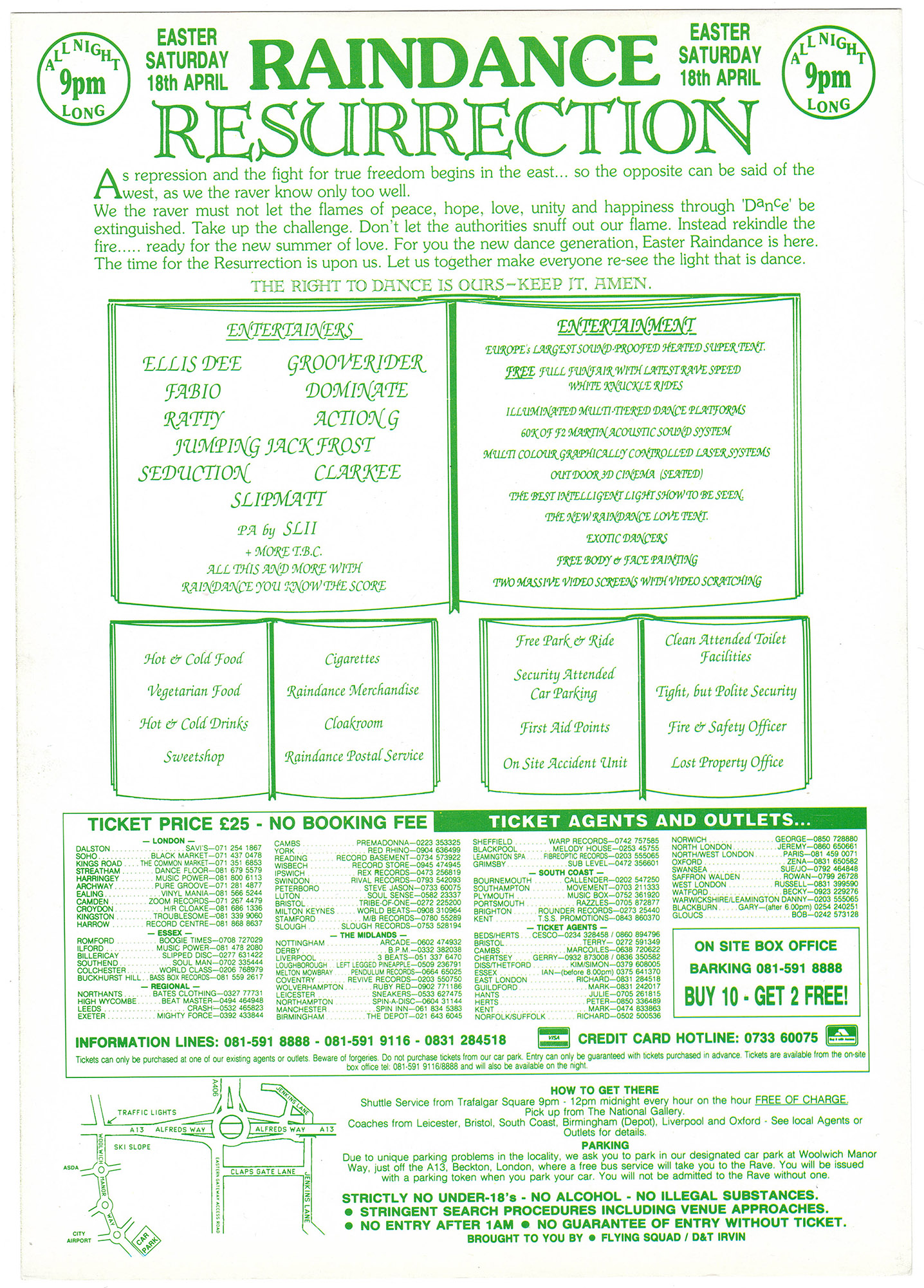 The promoters were Paul Nelson, Lou Lewis (caretaker of the site), and Ray Spence, a rare groove promoter. Their aim was to run a licensed, all-night event at a time when most raves were illegal. Newham Council confirmed that the clubhouse carried a drinks licence, which the organisers took as authority to stage the party. Flyers promised “10,000 strong – dance ’til dawn” under a circus tent. Around 500 people attended the first event, with DJs including Fabio, Grooverider, Linden C, Cleveland Anderson, Colin Dale and Slipmatt. Police visited but allowed it to continue, making it Britain’s first licensed all-night rave.
