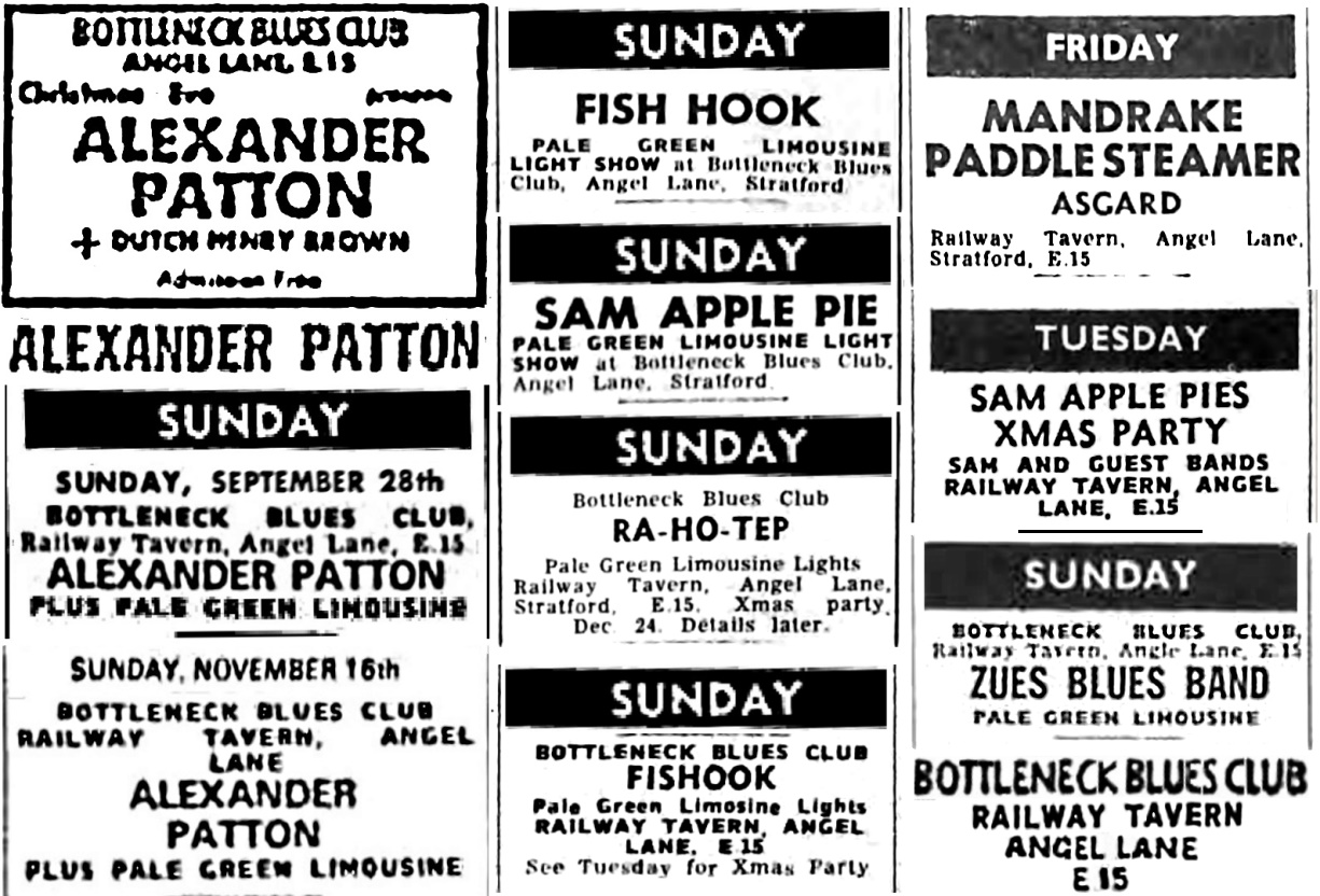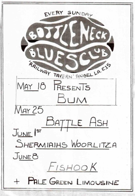 Actually, yeah, all the pubs up around there did live bands. And there was also, from about ’66 onwards, late ’66 early ’67 in the Railway Tavern in Angel Lane, there was a blues club called a the Bottleneck Blues, and that was on a Sunday night, and a few couple years later, me and a friend started a sort of what Frank Zappa referred to as a, you know, a hippie, hippie underground sort of place at the Railway Tavern, you know, was upstairs. It wasn’t underground. And the landlord there used to claim that he always knew when I was dancing because I weighed about 20 stone, because he used to loose plaster off his ceiling. He tried to charge us for it. And that was quite good, you know, and the Bottleneck had that was a really good place to go.